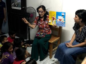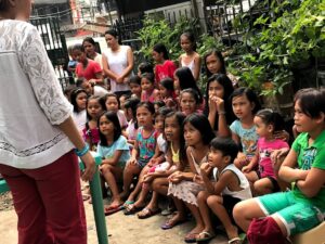 日本昔ばなし「3枚のお札」を語る。子ども達は、タガログ語を喋るので通訳のお姉さんが傍にいる。途中から身振り手振りと日本語で語ったが、十分に通じた。