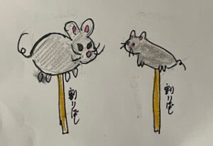 画用紙に太ったねずみ、やせたねずみを描く。なんだかお年寄りの顔になってしまいました(笑)が、子どもが描くと若い元気な顔になります。