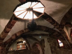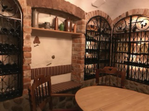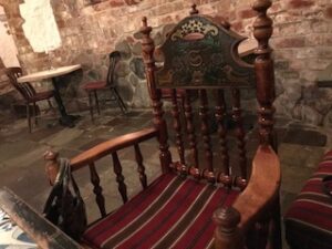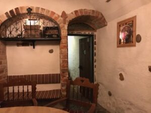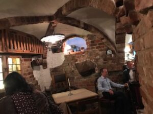 濃い茶色の重々しい扉を押しあけて中に入ると、すぐにはテーブルも椅子もはっきり見えません。かなり思い切りが要りますが、入る価値はあります。照明は薄暗く、小さな火窓から外の光が差し込んできます。ヨーロッパ人は昼でも室内は明るくしません。